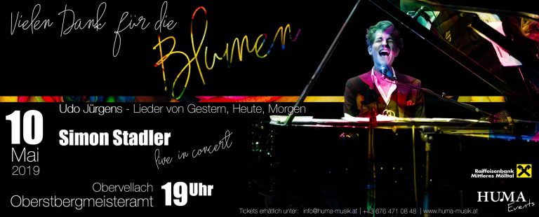 „Lieder von Gestern, Heute, Morgen“, so lautet der Programmtitel des Pianisten und Sängers Simon Stadler. Mit Udo Jürgens’ Lieder vom gleichnamigen Album „Gestern, Heute, Morgen“, leitet Stadler, der aus Maria Saal stammt, den Weg zu eigenen Songs seines 2018 erschienenen Albums „Let The Sun Shine On You“ ein.